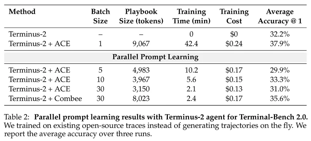 1. 速度与质量的双重飞跃 在 Terminal-Bench 任务中,Combee 实现了惊人的 17倍 训练加速。更关键的是,在如此高的加速下,其准确率依然保持在 35.6%,远超那些因简单并行化而导致性能崩塌(准确率跌至 31% 甚至更低)的基准方法。在 AppWorld 中,当批次扩大到 40 时,传统方法几乎退化到了无学习状态,而 Combee 依然能维持甚至超越单线程学习的水平。