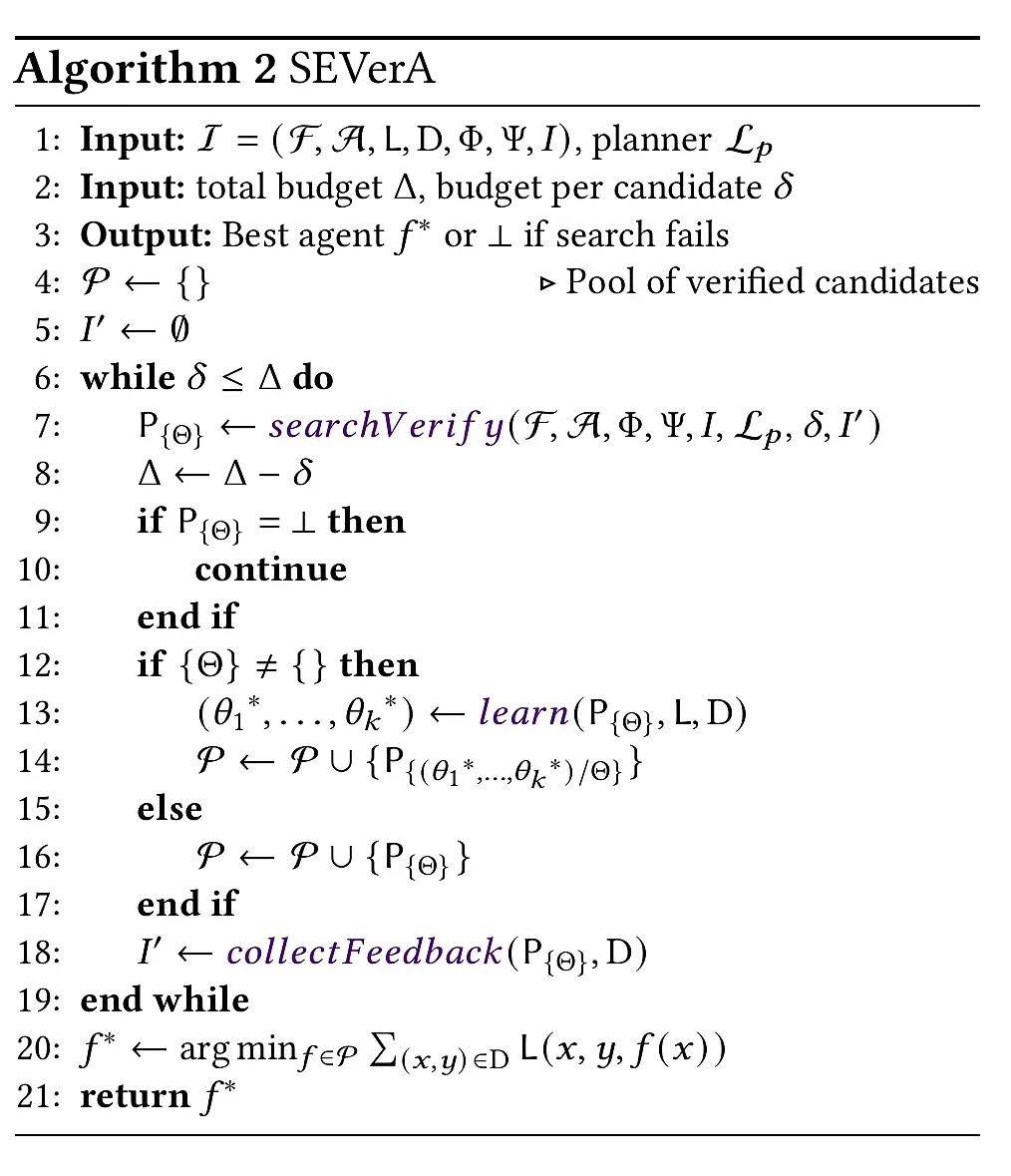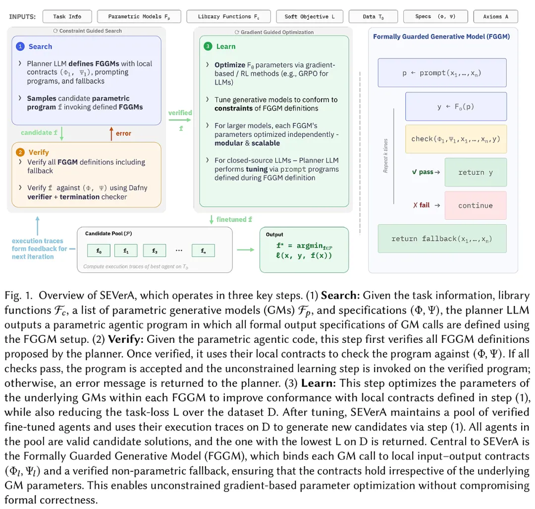 搜索阶段(Search): 规划器 LLM 负责在一种支持验证的语言(如 Dafny)中采样候选程序。这些程序不仅包含逻辑流程,还定义了 FGGM 的本地契约。这就像是在设计一个精密的机械结构,预留了安装动力源(模型调用)的接口。 验证阶段(Verify): 利用 Dafny 内置的验证器,对候选程序进行静态分析。由于 FGGM 已经保证了局部调用的正确性,验证器可以证明整个智能体程序在处理任何输入、任何参数设置时,都能满足全局行为规范。这一步将复杂的“受限学习”问题简化为了“无约束学习”问题。 学习阶段(Learning): 一旦程序结构被证明是安全的,SEVerA 就会启动大规模的梯度优化(如 GRPO 风格的强化学习)。此时,模型参数的微调目标是提高任务效用(Soft Objective),而无需担心破坏安全性,因为“逻辑护栏”已经固化在程序结构中。