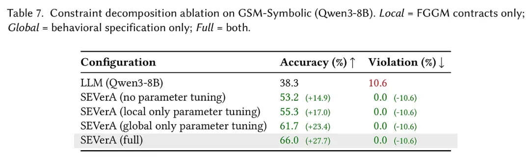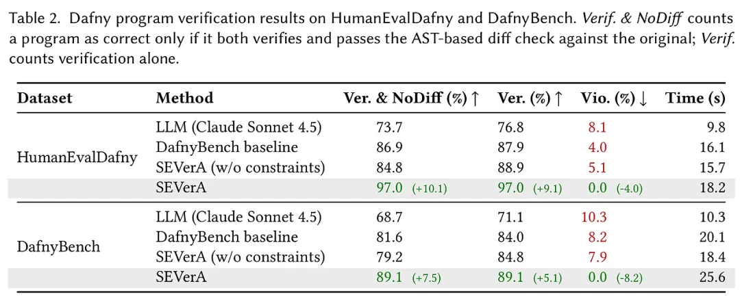 局限性分析: 尽管表现卓越,SEVerA 仍面临一些挑战。首先,它高度依赖规划器 LLM 编写 Dafny 代码和一阶逻辑公式的能力,这对于较弱的模型可能存在门槛。其次,对于某些极度复杂的非线性约束,定义合适的 FGGM 契约和兜底程序可能需要较多的人工先验。