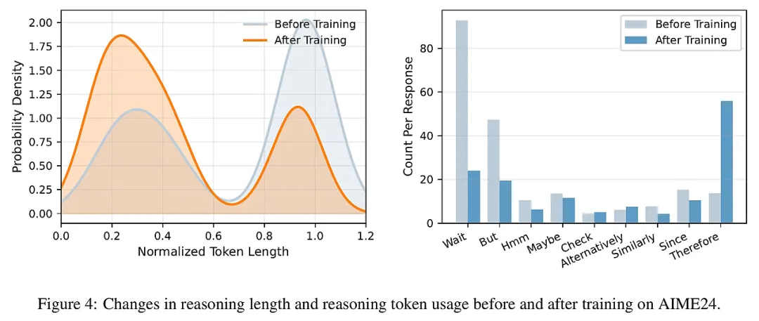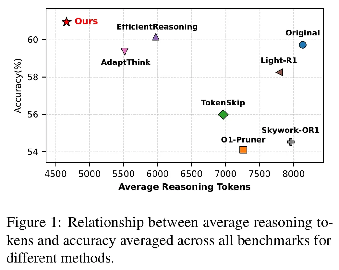 实验结果令人振奋:在7B模型上,该方法在保持甚至提升平均准确率的同时,将推理所需的Token数量大幅削减了42.7%。特别是在极具挑战性的AIME25测试中,准确率从29.00%提升至31.67%,而推理长度却从12779个Token骤降至6977个。这一结果有力地反驳了“推理越长越聪明”的迷思。
