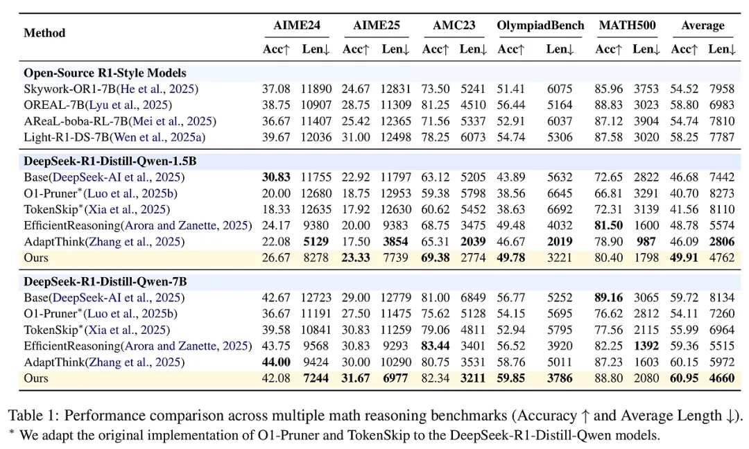 本研究在DeepSeek-R1-Distill-Qwen(1.5B和7B版本)上进行了严谨的验证,涵盖了AIME、AMC、MATH500及OlympiadBench等多个高难度数学推理基准测试。实验设计不仅关注最终的准确率,更将“推理长度”作为核心评价指标,旨在评估模型的“智商功耗比”。