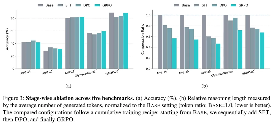 冷启动监督微调(SFT):利用剪枝后的高纯度思维链数据对模型进行初始化,赋予模型一种“言简意赅”的先验偏好。 偏好对齐优化(DPO):通过构建“精炼轨迹 vs 冗余轨迹”的对比对,强制模型在多个正确答案中选择推理成本更低的那一个。这就像是在告诉模型:不仅要答对,还要赢得漂亮、赢得高效。 带长度惩罚的强化学习(GRPO with Length Penalty):这是最关键的内化阶段。在传统的正确率奖励基础上,引入了一个动态的长度惩罚项。该惩罚项以组内最短正确路径为基准,对冗余长度进行非线性惩罚。这种机制迫使模型在探索过程中自发地压缩无效思考,最终形成一种既稳健又高效的推理范式。