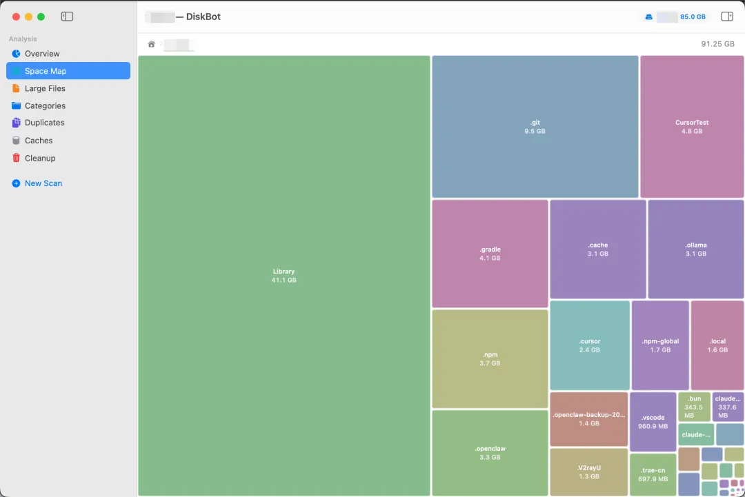 ▲ DiskBot TreeMap 视图 — 彩色方块面积代表文件大小,一眼定位大文件