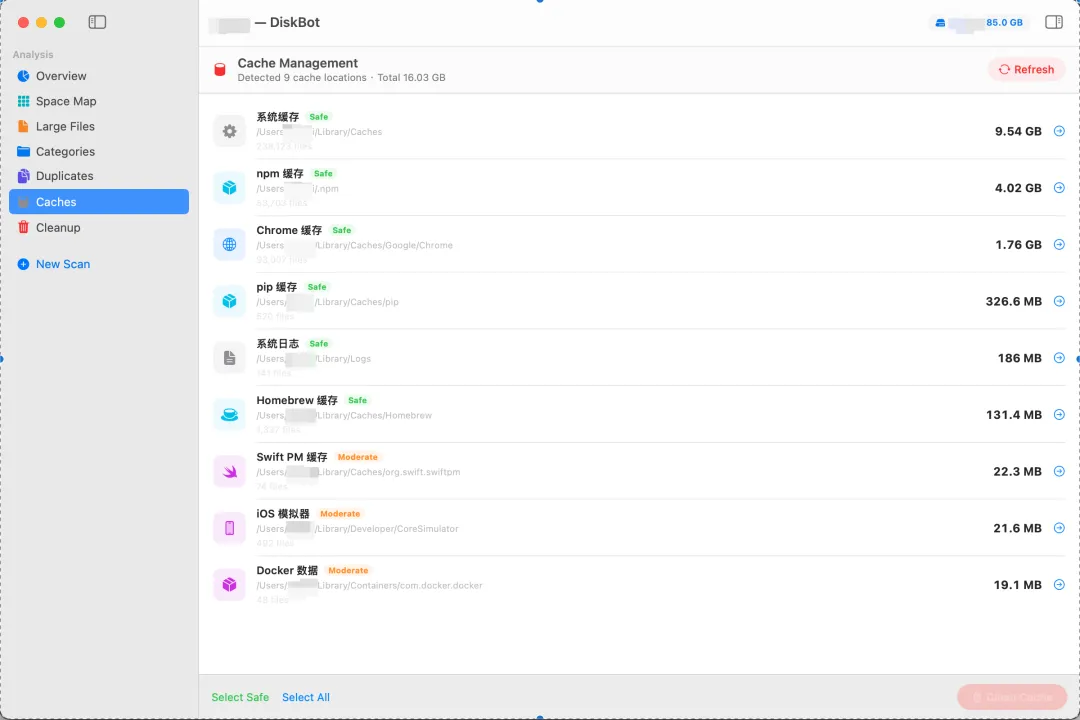 ▲ DiskBot 缓存检测 — 安全标注可清理的缓存