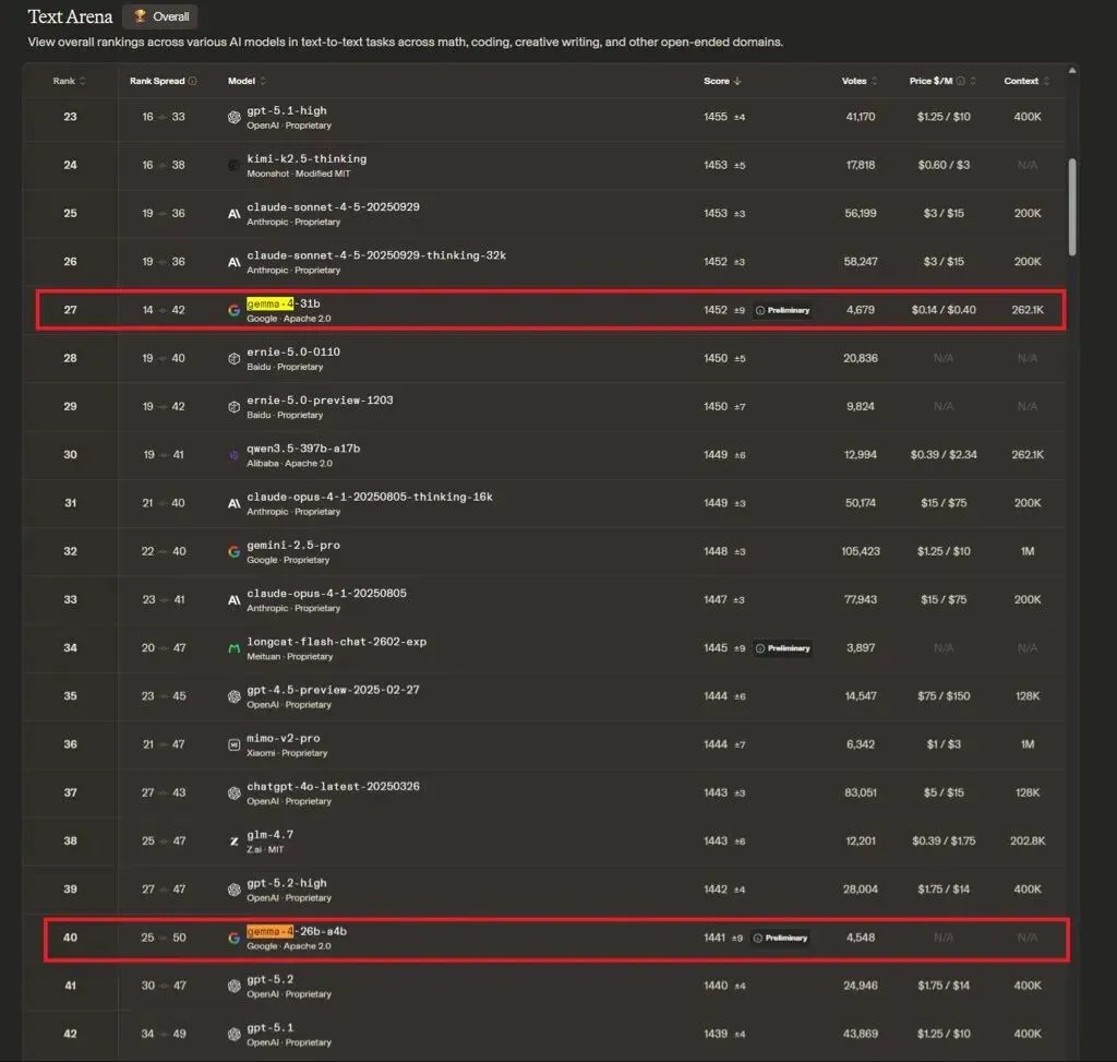- 31B Dense(全量307亿参数)——下载20GB,要24GB以上显存。Arena排行榜第三就是这个版本的成绩。RTX 4090或M系列Mac 32GB以上内存才能跑舒服。