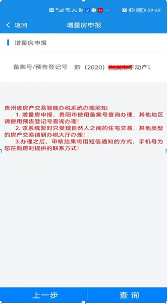 注意:贵阳云岩、南明、观山湖区等八区纳税人可使用网签备案号或预告登记号获取外部信息,其余市州及贵阳市开阳县、息烽县、修文县、清镇市只能通过预告登记号查询获取外部信息。无预告登记或无网签备案信息则无法通过网上办理;
