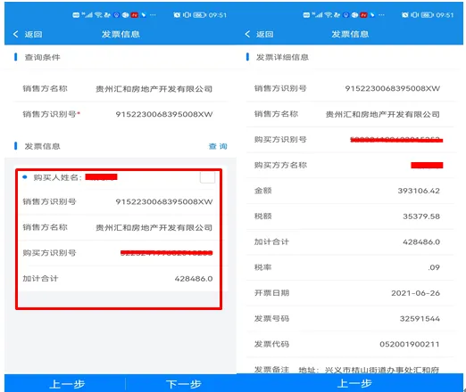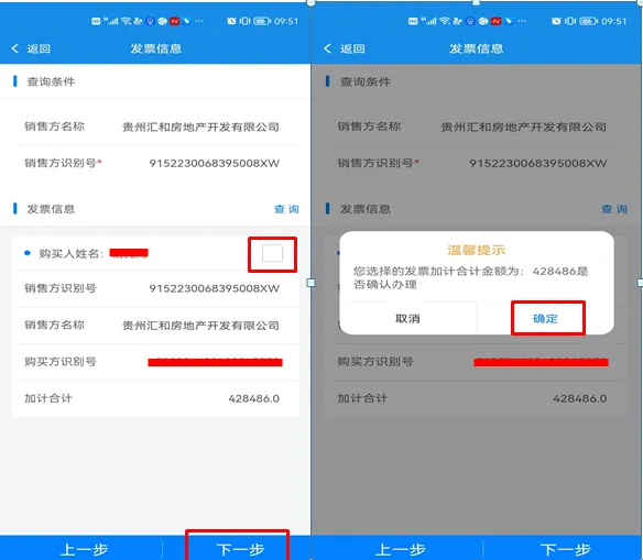 6.核对发票信息无误后,请勾选该套房产对应的发票信息,点击【下一步】,弹出提示,点击【确定】。(若纳税人在同一房地产开发企业购买多套住房或同一住房开具多张发票,则会获取到多张发票信息。)