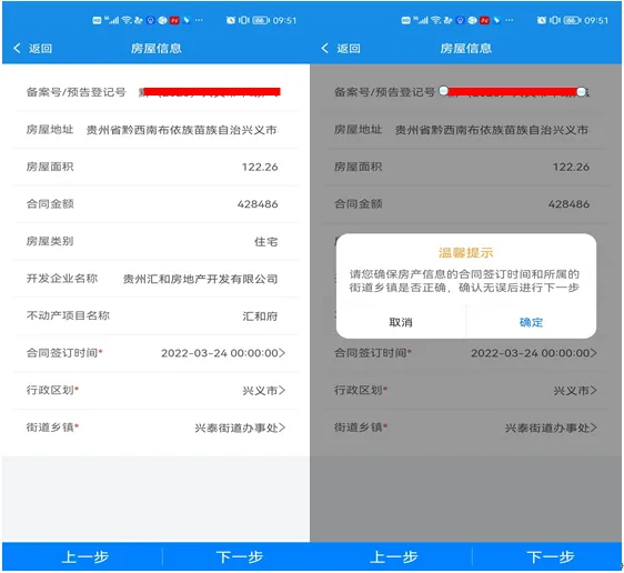 7.进入房屋信息展示界面,请务必核对“合同签订时间”、“行政区划”、“街道乡镇”,对于同实际不符的信息,手工补录更正。核对无误后,点击【下一步】。