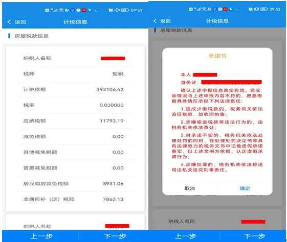 9.进入税费信息展示界面,确认税款计算无误,点击【下一步】。确认承诺书内容,点击【确定】。