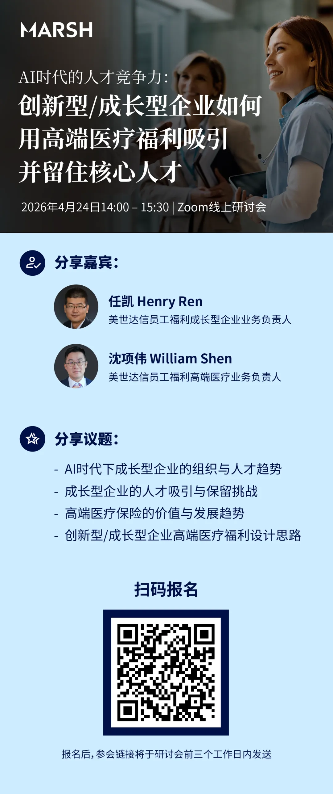 美世达信员工福利(MMB)将于2026年4月24日(周五)14:00-15:30举办线上研讨会,聚焦“AI时代的人才竞争力:创新型/成长型企业如何用高端医疗福利吸引并留住核心人才”这一命题,深度解析四大核心内容: