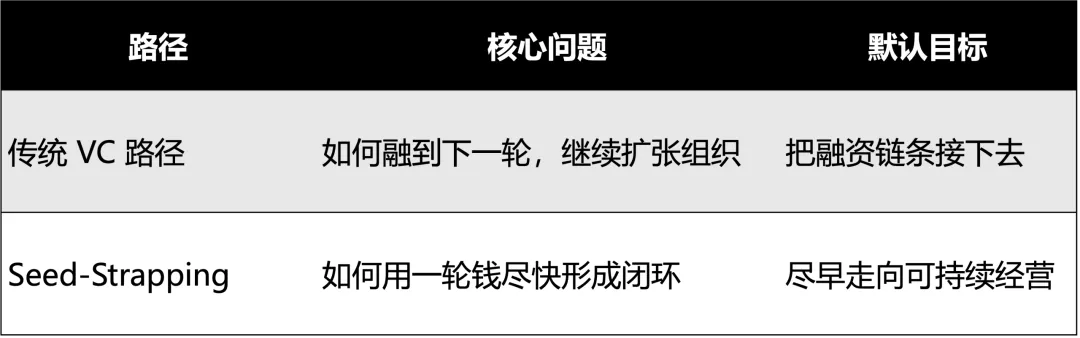 这和传统 seed 的逻辑不同。传统种子轮本质上是融资链条的起点,它的任务往往是帮助公司证明自己值得拿到下一轮更大的融资。而在 Seed-Strapping 模式里,首轮融资更像是一轮“成型性融资”——它服务的不是下一轮故事,而是独立成立的可能性。