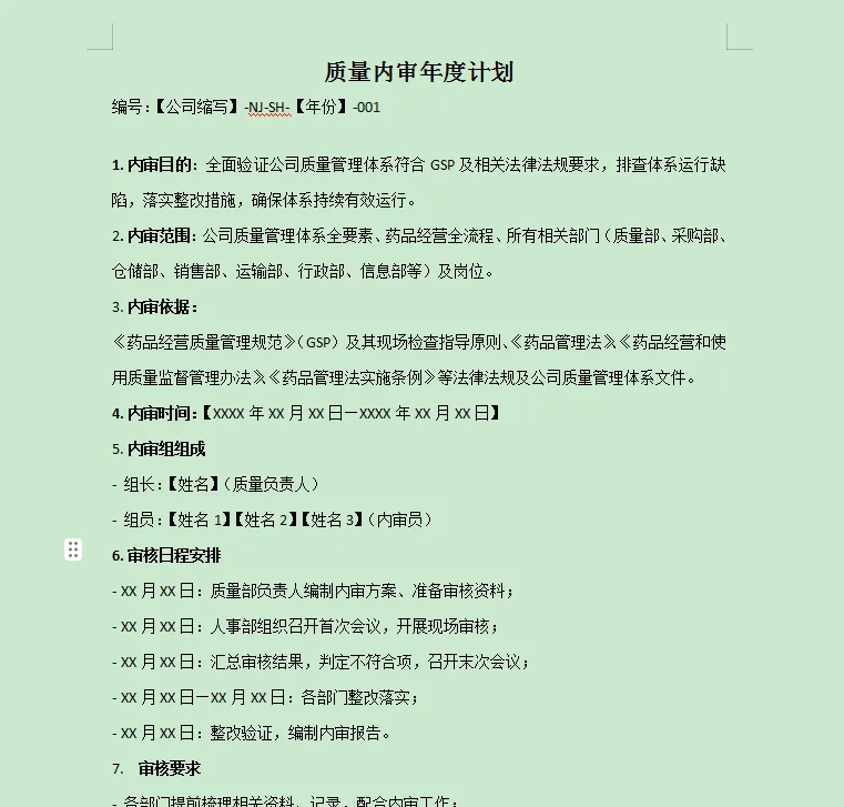 1. 负责牵头组织、策划、实施GSP内部审核工作,制定内审计划、方案,组建内审组;