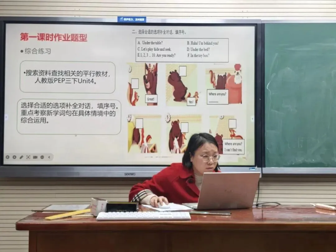 朱君老师做题为 《AI赋能三下Unit 4单元作业的优化策略》 的主题交流,系统展示了如何借助AI技术及平行教材资源,优化单元作业设计,提升作业的层次性、情境性与拓展性。
