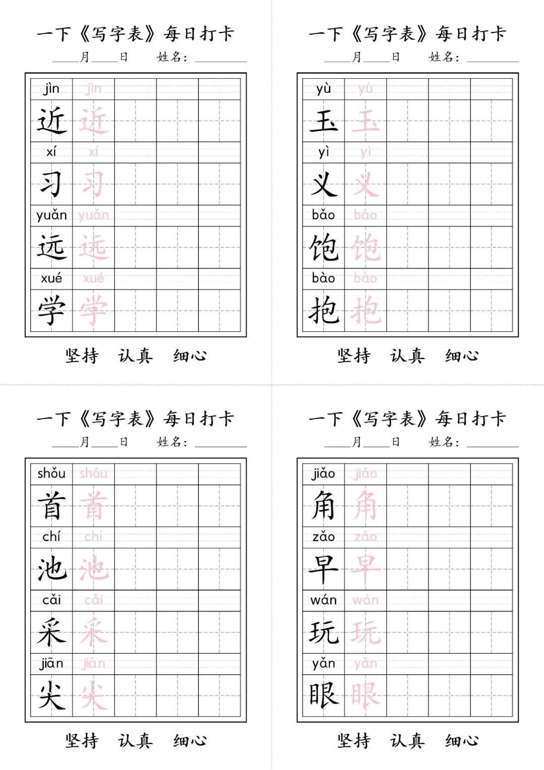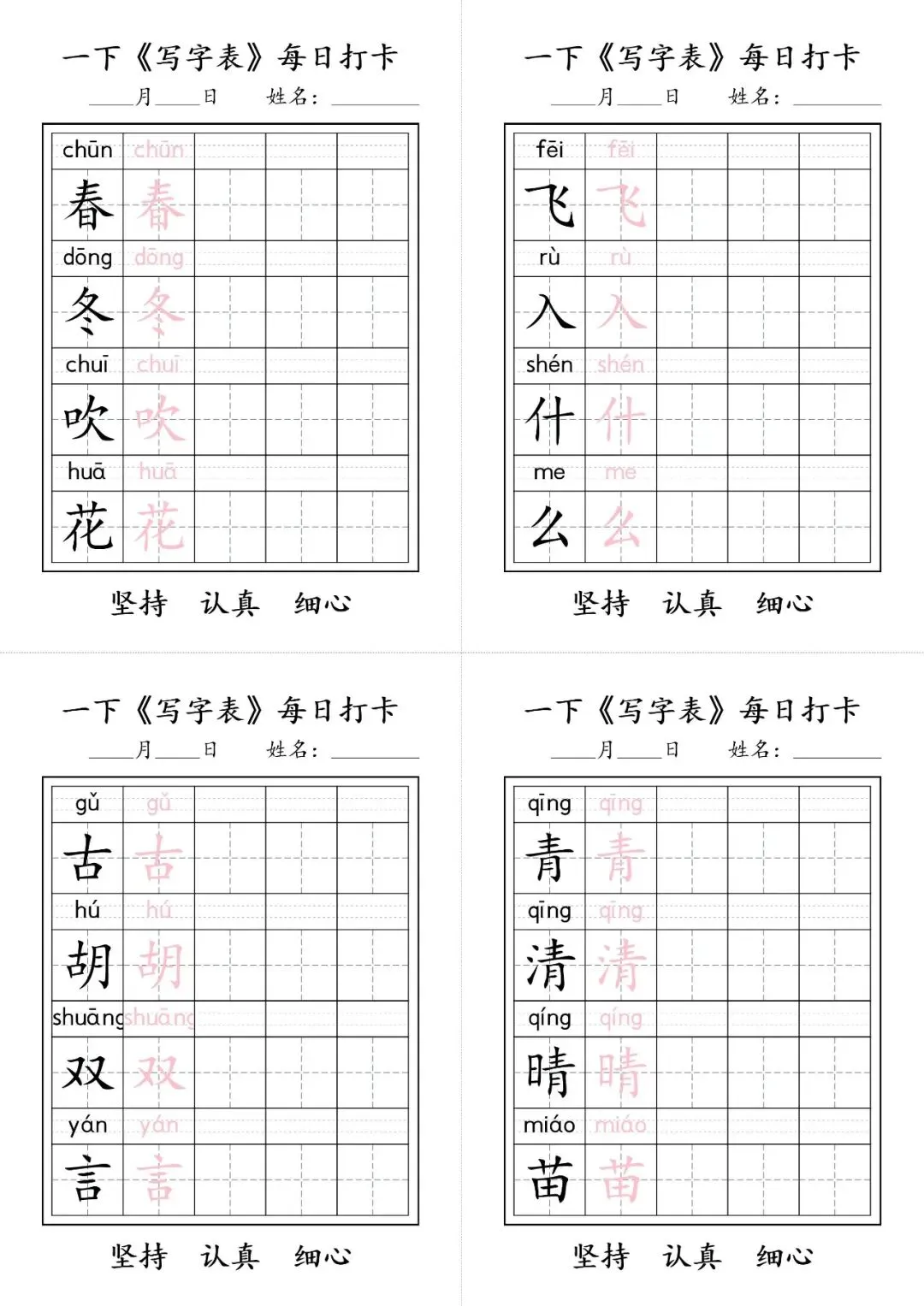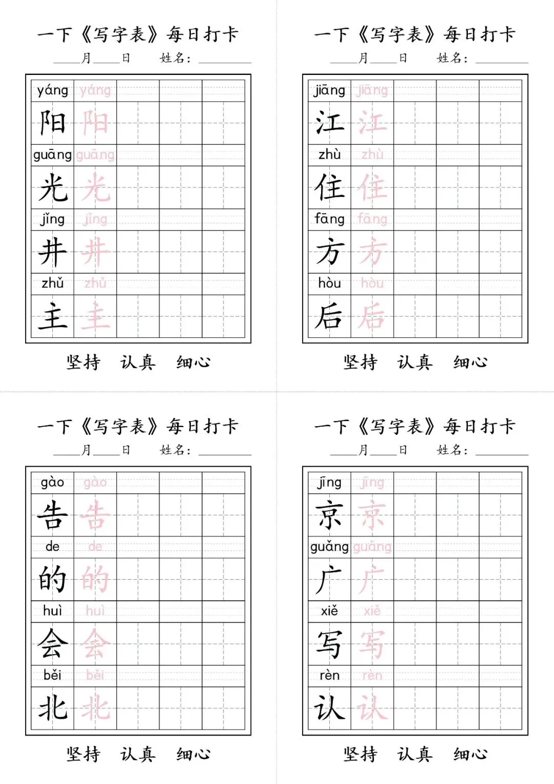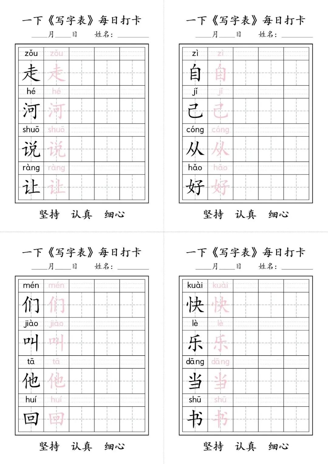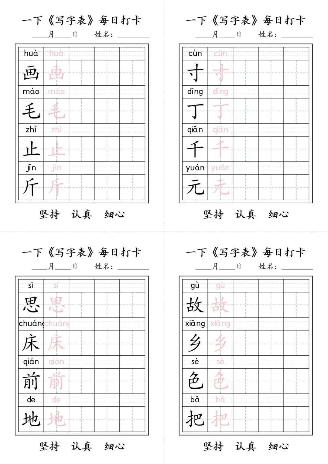 资料设计简洁清晰,每页都有日期、姓名栏和 “坚持、认真、细心” 的鼓励语,适合孩子每日坚持练字,循序渐进打好写字基础,既能巩固课内必会生字,又能提升书写工整度,培养每日学习的好习惯。和其它的字帖相比,这份每个要写的数量不是很多,小朋友会有更高的积极性。