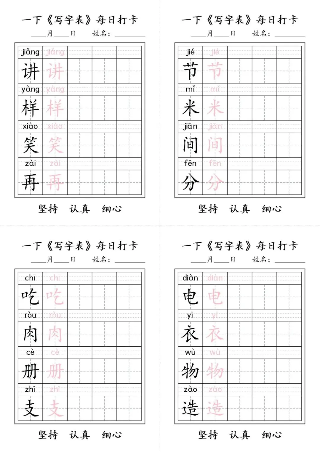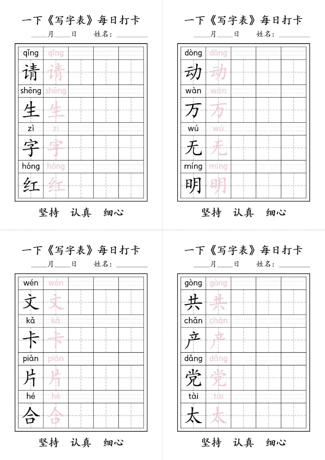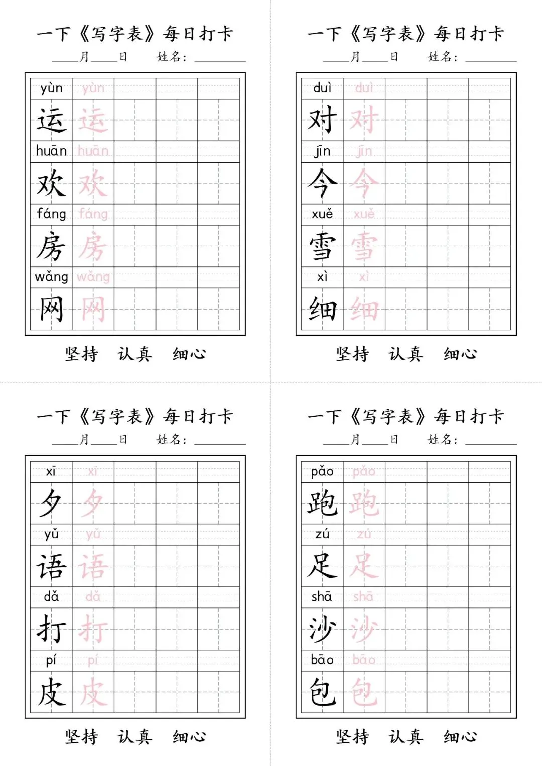 这份资料是一年级下册语文写字表配套练字打卡纸,按课本写字表顺序排版,每个生字都带拼音,预留了充足的书写格,孩子每天照着描红、临摹,能规范笔顺、握笔和字形,每天练一页,轻松完成全册生字书写任务。