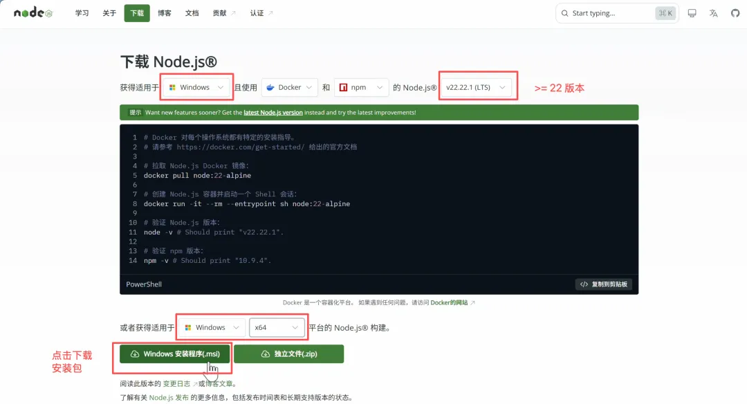 这行命令会自动帮你安装所有依赖和OpenClaw 本体,一步到位,装完就可以直接跳到 第二步 - 安装配置 OpenClaw。你可以把它理解成OpenClaw 的 “发动机”,OpenClaw 是用 JavaScript 语言写的,而 Node.js 就是让 JavaScript 在你电脑上跑起来的运行环境。没有它,OpenClaw 就启动不了。打开Node.js 官网,选择对应你操作系统的安装包,并执行下载。注意版本号 至少选 22 以上,低于这个版本就会逮虾失败。Releases · coreybutler/nvm-windows