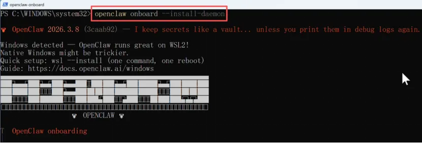 环境装好了,接下来进入OpenClaw 的新手引导程序,定制你的小龙虾 。在PowerShell(Windows 系统)或终端(Mac / Linux 系统)中执行下列命令:openclaw onboard --install-daemon