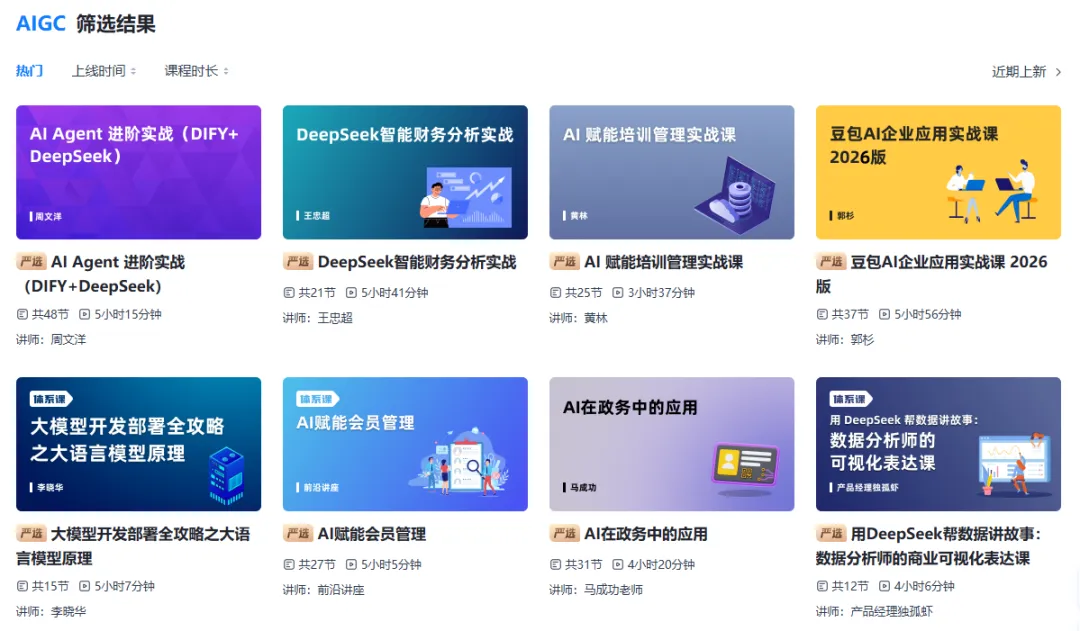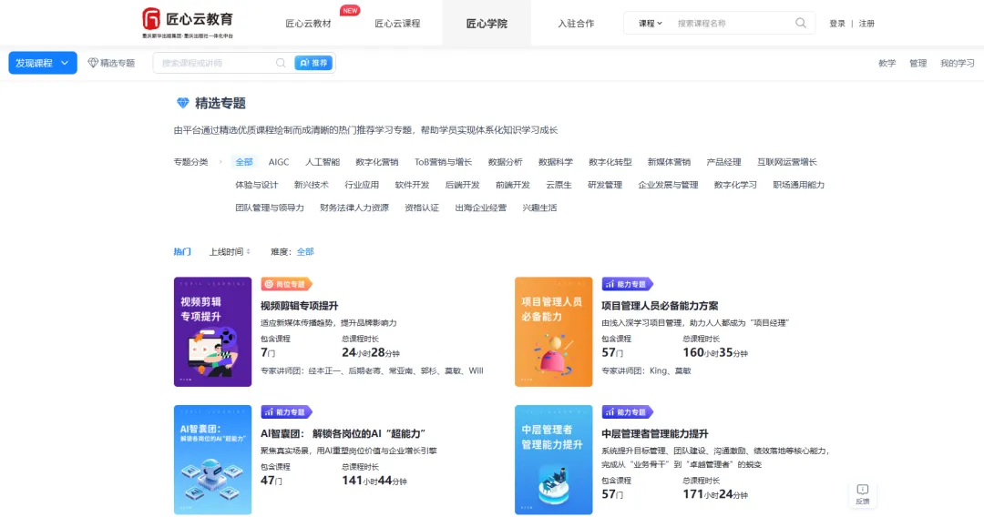 点进匠心学院主页,你会被琳琅满目的课程所吸引——从AIGC、人工智能到数字化营销、新媒体营销,从财务法律人力资源到职场通用能力,8000余门实战好课覆盖了互联网、金融、制造业、服务业等热门行业。