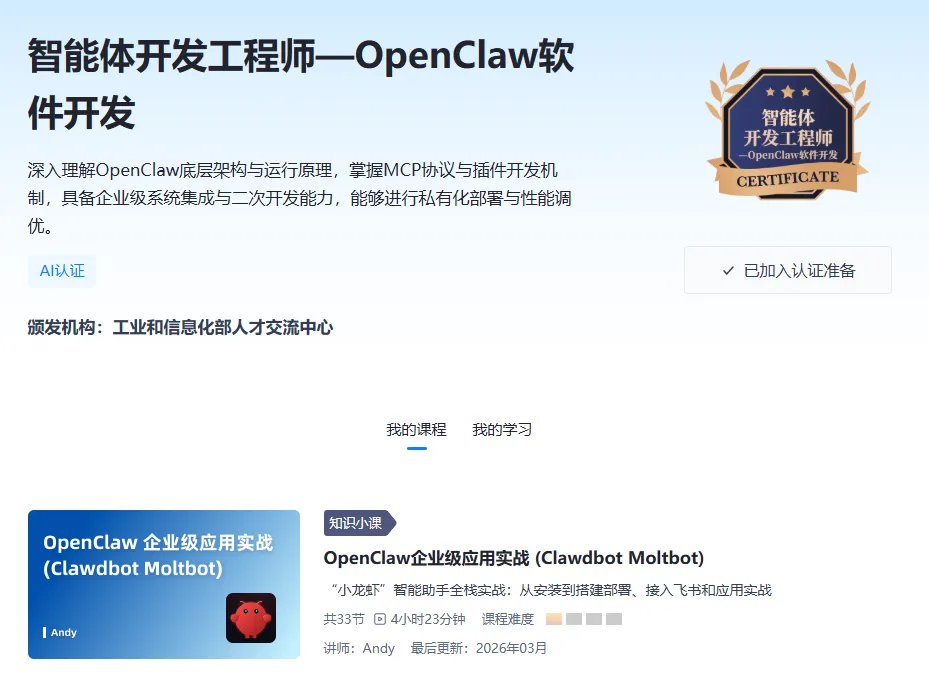 ▲“智能体开发工程师—OpenClaw软件开发”认证页面(点击图片放大查看)。