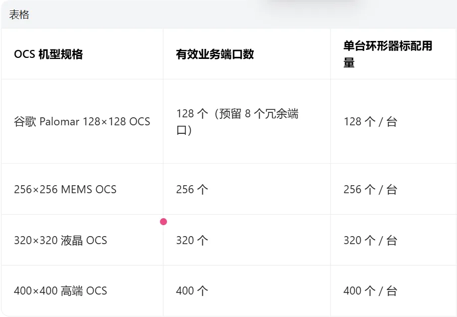 单台OCS环形器标配用量 = 有效业务端口数 × 1 单集群OCS环形器总用量 = 单台用量 × OCS部署台数 全链路总用量 = 单台OCS用量 × 2(OCS侧+对端光模块侧)