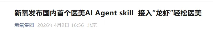 2026年4月初,医美服务平台新氧旗下青春诊所正式推出了国内首个医美AI Agent技能包——Soyoung-Clinic-Tools skill。这则消息在行业内引发关注,这则消息之所以能引发行业广泛关注,核心并非“首个”的标签,而是其背后折射的医美AI技术迭代趋势:从浅层的“对话交互”,正式迈向深层的“执行落地”,标志着医美智能化进入全新发展阶段,也为长期处于“信息不对称”困境的医美行业,提供了标准化、智能化的破局路径。
