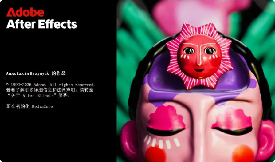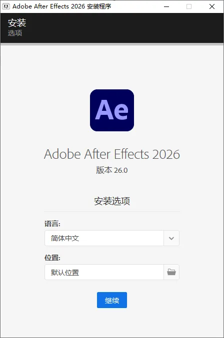 AE安装包After Effects 2026 (v26.0.0.67)一键安装使用After Effects 2026 (v26.0.0.67)是影视制作,动画设计必不可少哦啊的软件。今年的这个新版本的软件有以下的特点:原生 3D 参数化网格工具Substance 3D 材质(SBSAR)支持3D 灯光阴影增强可变字体轴动画矢量导入优化Unmult 键控效果还是老规矩,我给大家准备好了安装包,大家先把安装包保存到自己的网盘上,然后下载下来再统一解压。接着找到里面的安装文件,双击打开。就会出现如下的安装界面。安装包地址:https://pan.quark.cn/s/6df80679ce58点击继续按照它的提示一步步安装完成就可以使用了,是不是非常简单?接下来我还会分享一的许多有用的插件,装上这些插件能够在使用的时候事半功倍。