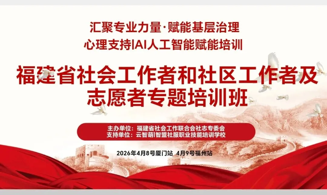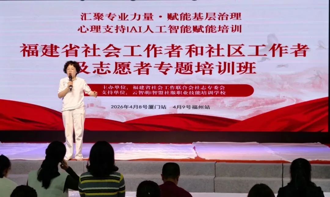 2026年4月8日至9日,由福建省社会工作联合会社志专委会主办的“心理支持+AI人工智能”公益培训,先后在厦门、福州两地圆满落幕。本次培训聚焦我省社会工作者、社区工作者及志愿者的真实工作痛点,以个案工作、小组工作、社区工作、矛盾调解、信访、特殊人群关爱、志愿者管理建设、社会治理创新等一线场景为蓝本,量身打造了一套“心理赋能+技能升级”的实战课程。