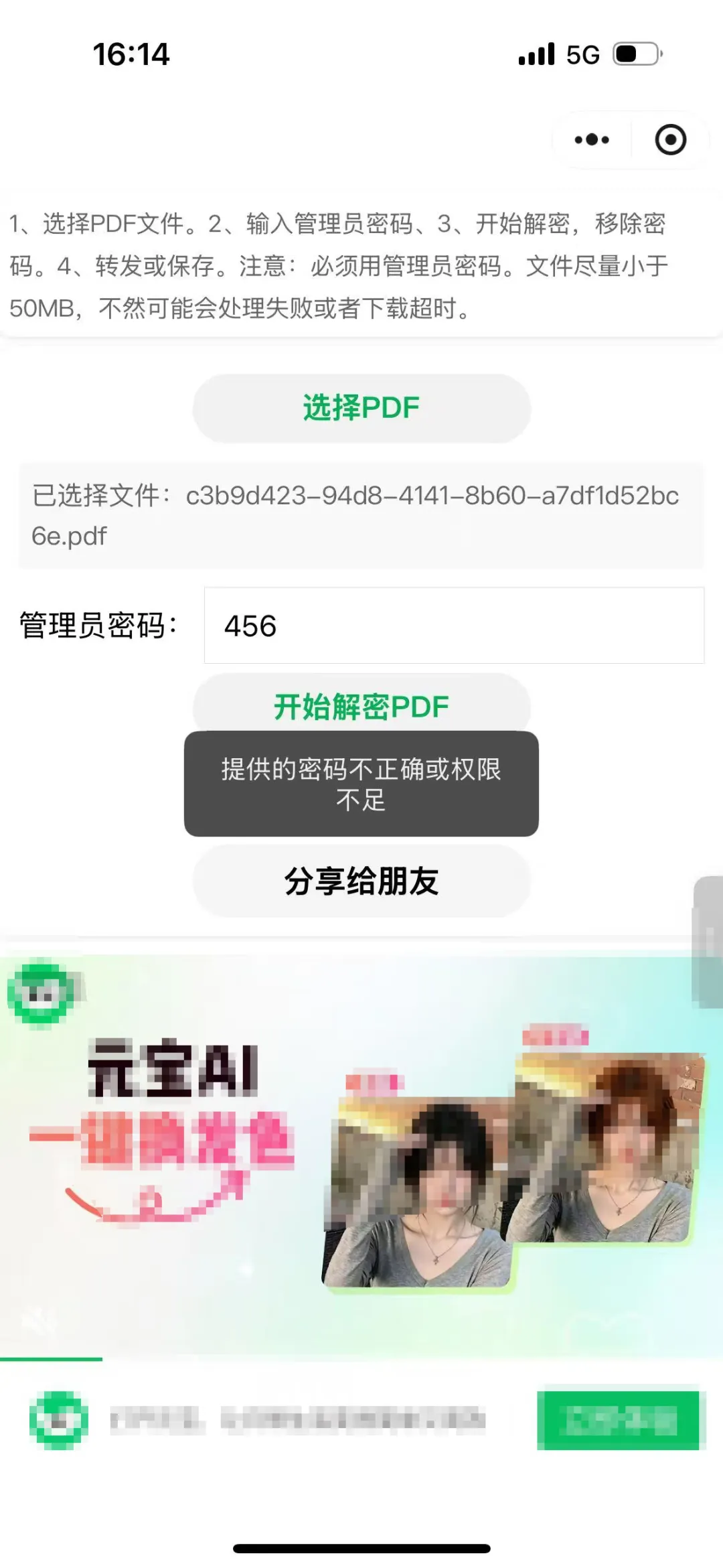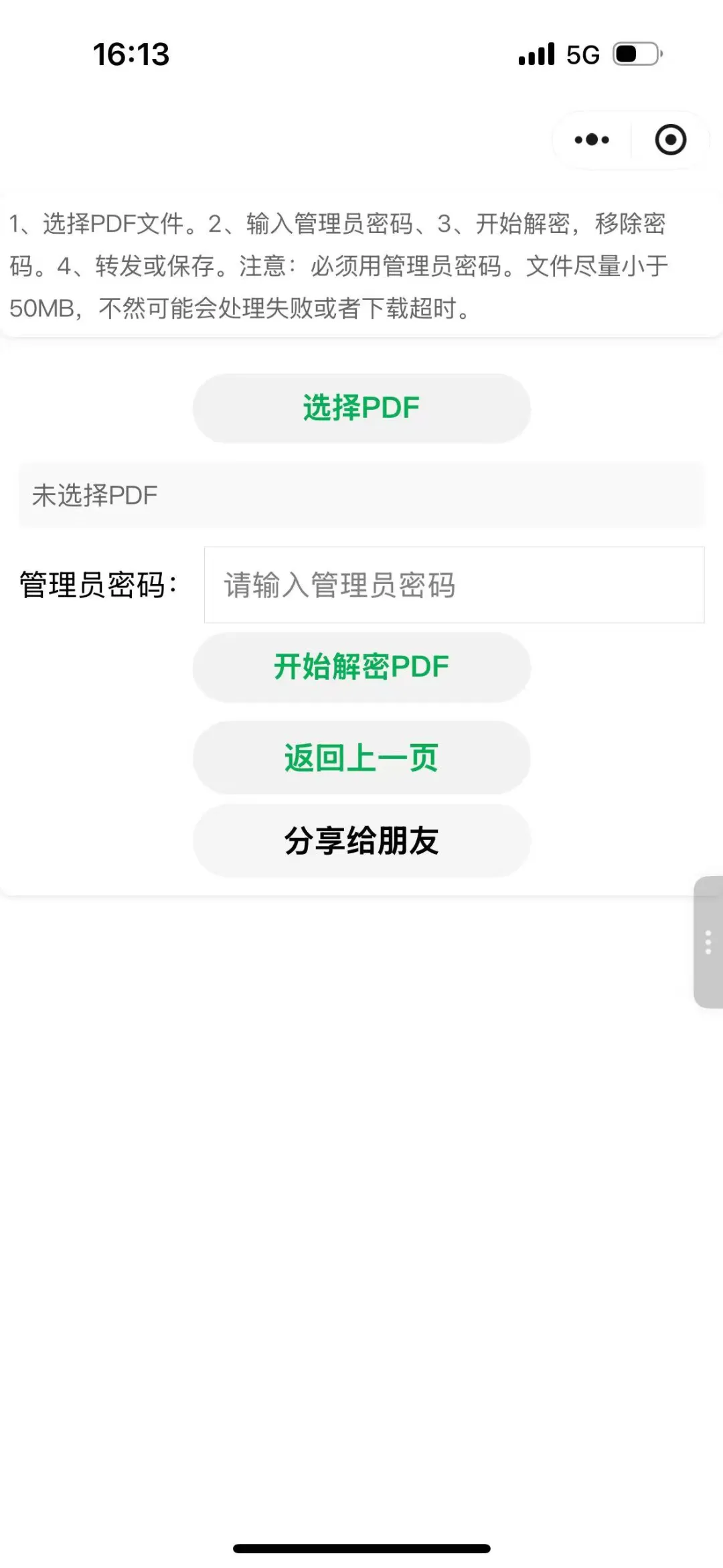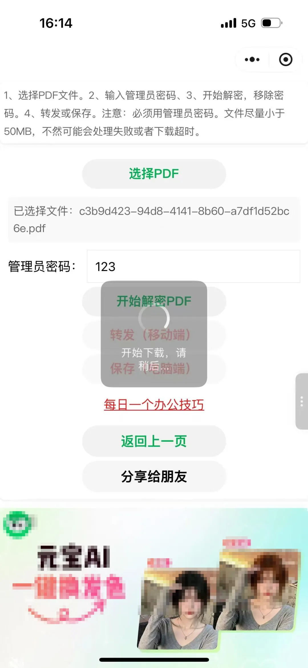 该功能是移除PDF的保护密码,前提是用户需要知道管理员密码才能移除。而不是随便移除,且必须是管理员密码,不能是用户密码,权限不够的。最后,文件大小尽量小于50MB,不然可能会处理失败或者下载超时哦。