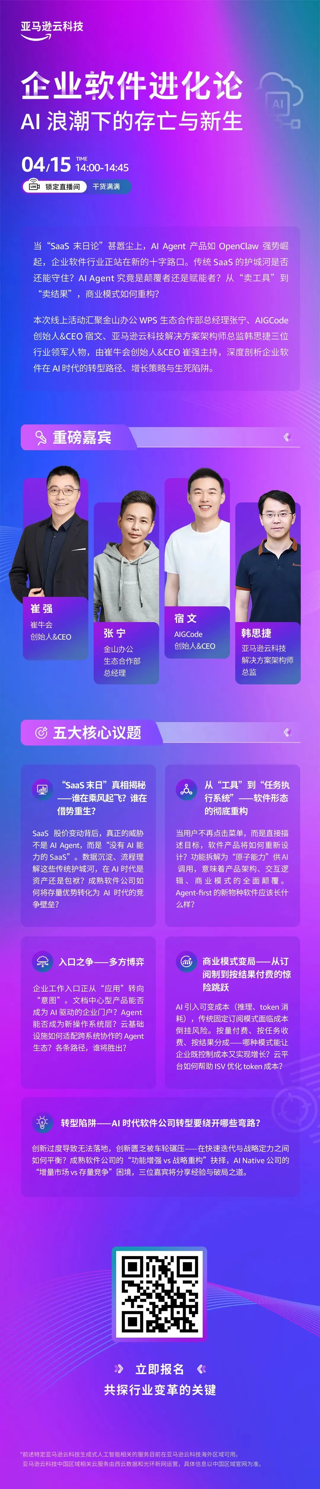 面对AI技术的强力冲击和企业软件紧张竞争格局,2026年4月15日,亚马逊云科技联合DTinsight中国数智发展研究中心,共同打造以“企业软件进化论:AI 浪潮下的存亡与新生”为主题的直播活动,将为行业带来一场深度思辨。本次直播将邀请技术专家、架构师等行业领军人物,聚焦数据、软件形态、入口之争、商业模式以及转型等相关话题,揭开“SaaS 末日论”的真相,探讨AI 浪潮中企业软件行业破局之道。
