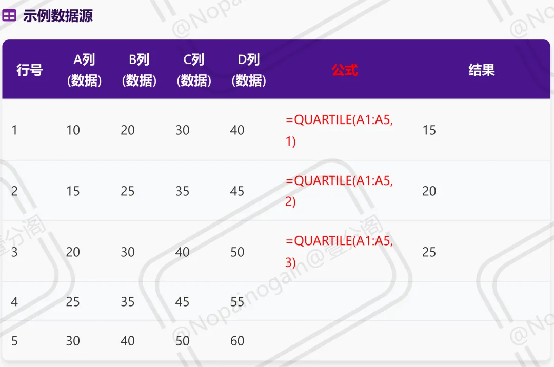 QUARTILE函数是Excel中常用的统计函数,用于返回数据集的四分位数,广泛应用于数据分析、统计分析等场景。