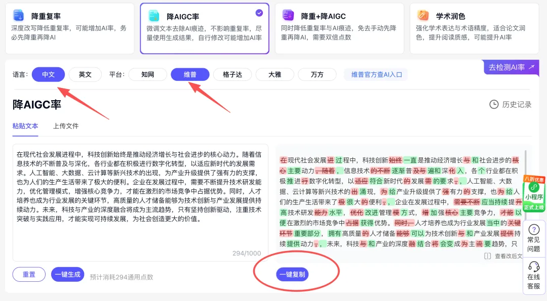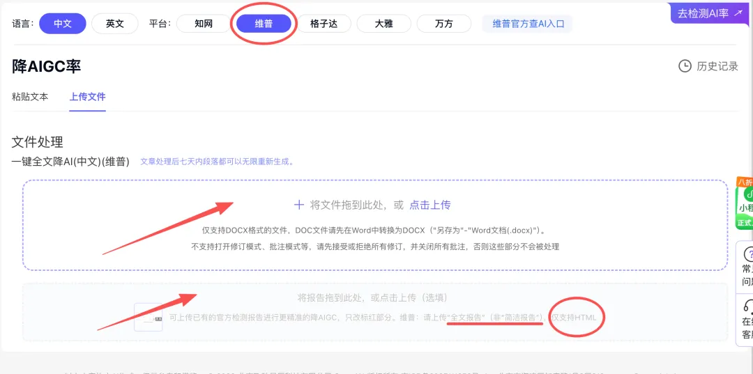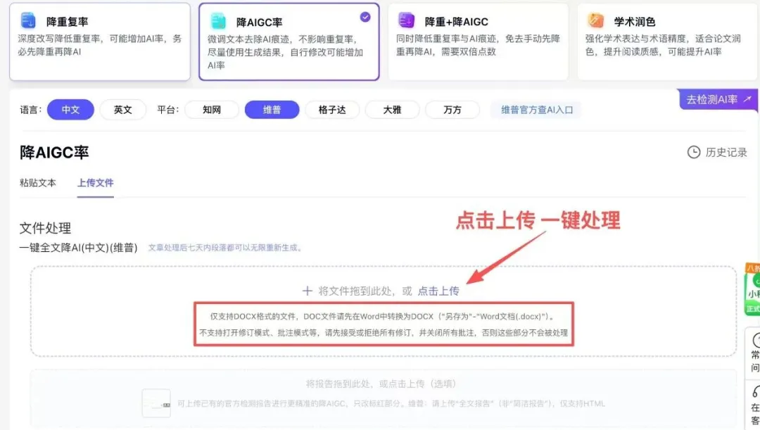 直接点击下方一键全文降AI功能:上传文件,下载即可,格式基本不变!不过下载后最好通篇核对一遍,看看有没有漏改或者误改的段落。