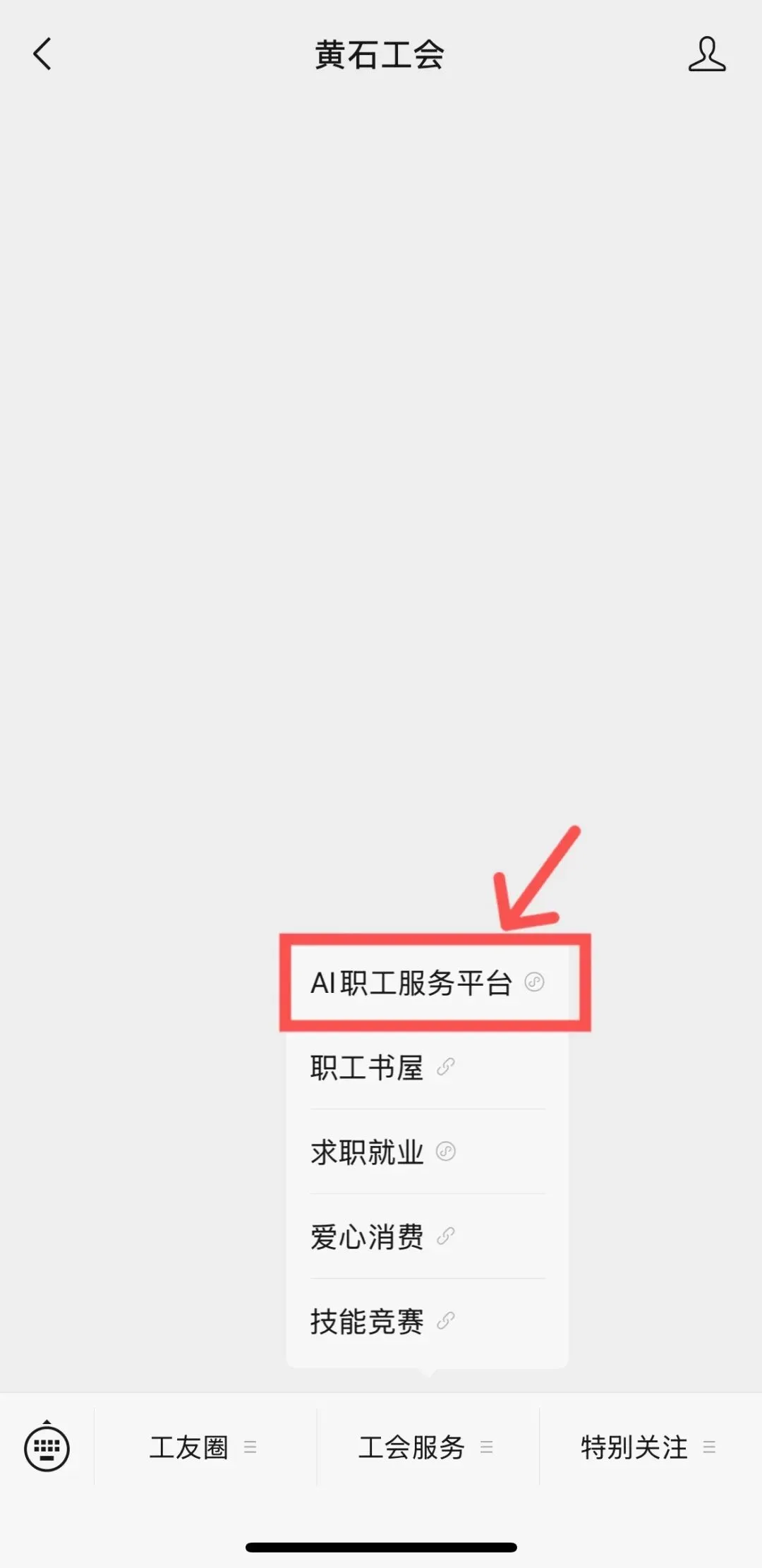 关注“黄石工会”公众号,通过底部菜单“工会服务—AI职工服务平台”进入AI职工服务平台小程序。