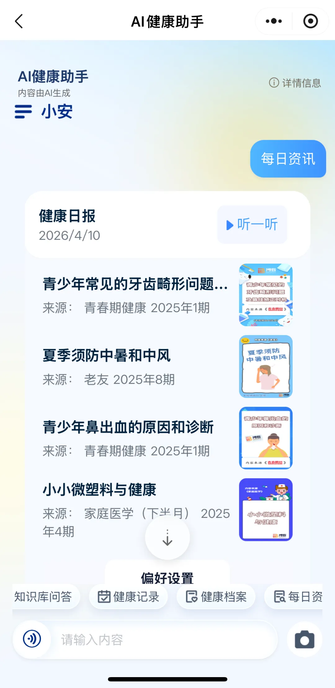 AI健康助手提供科学的养生建议、健康知识科普,还能根据个人体质给出个性化饮食、运动方案,还能进行健康打卡,做你的私人健康顾问。