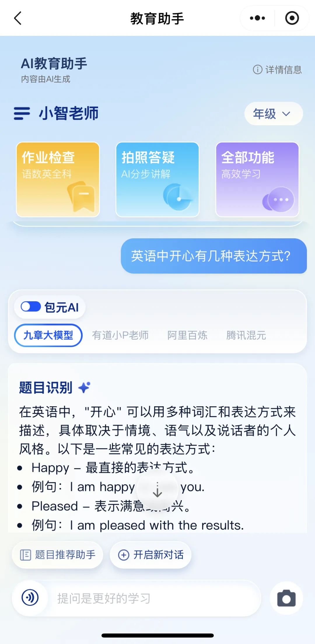 AI教育助手支持,手机拍照上传作业,可帮助您检查作业、解析难题,是学习路上好帮手。