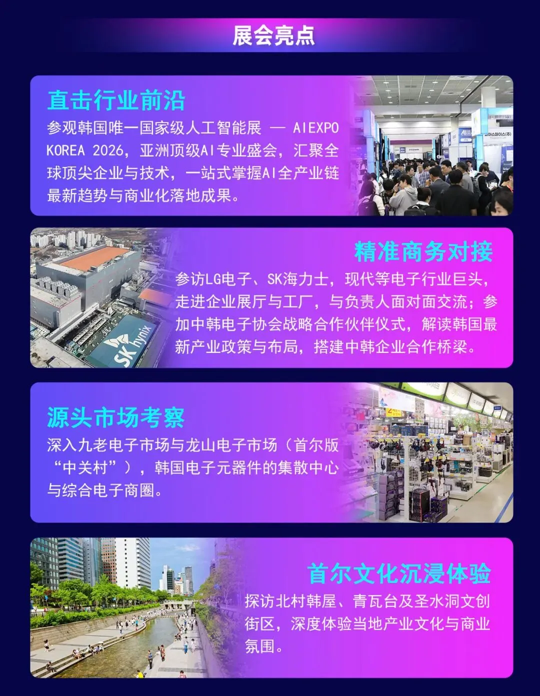 上午:参访SK 海力士/LG/三星,Winia(原大宇 Daewoo Electronics)现代,起亚,福库,现代等头部企业(五选二),与企业负责人深度交流,与企业负责人深度交流。