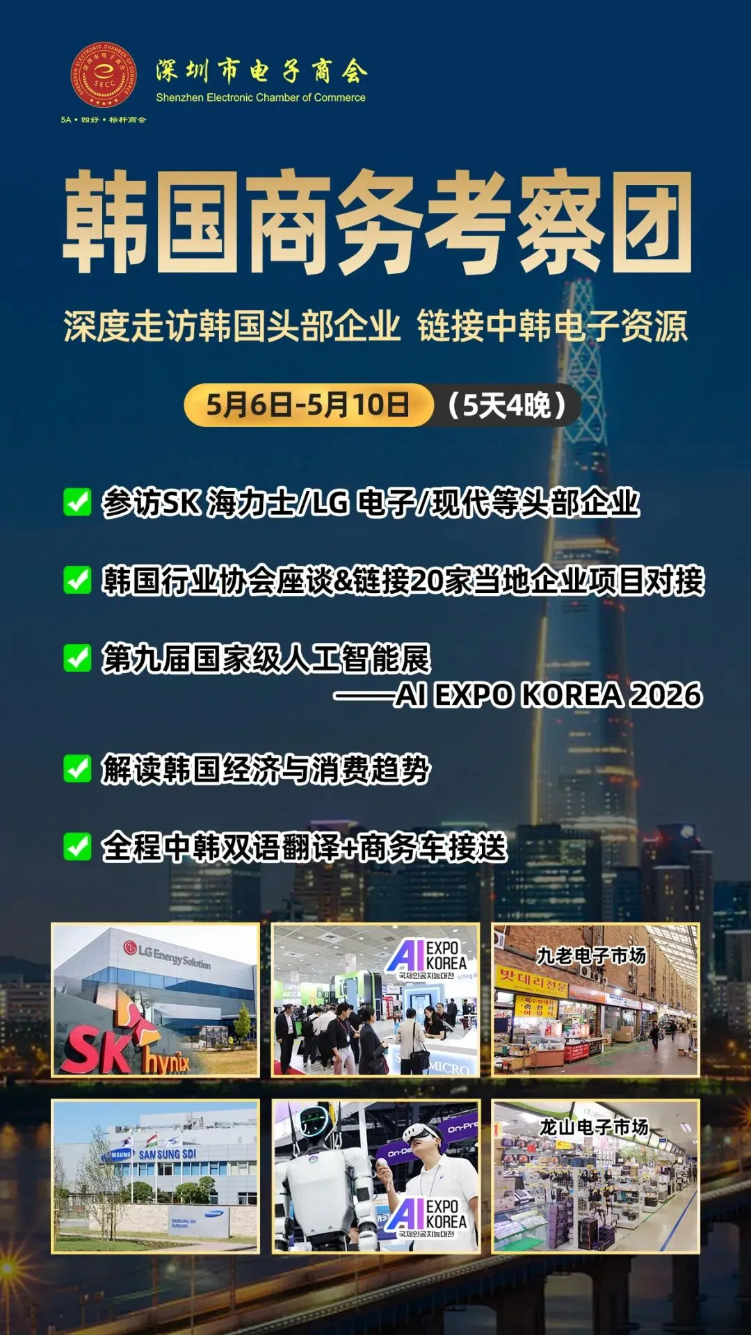 为助力企业抢抓全球人工智能产业发展机遇,深化国际交流合作,我会定于 2026 年 5 月 6 日 - 10 日组织赴韩国首尔开展商务考察。本次考察将通过头部企业参访、与行业协会座谈交流、参观韩国国家级人工智能展及走访当地核心电子市场等形式,为企业创造精准商务对接机会。在此,我们诚挚邀请各会员单位踊跃报名,相关事宜通知如下: