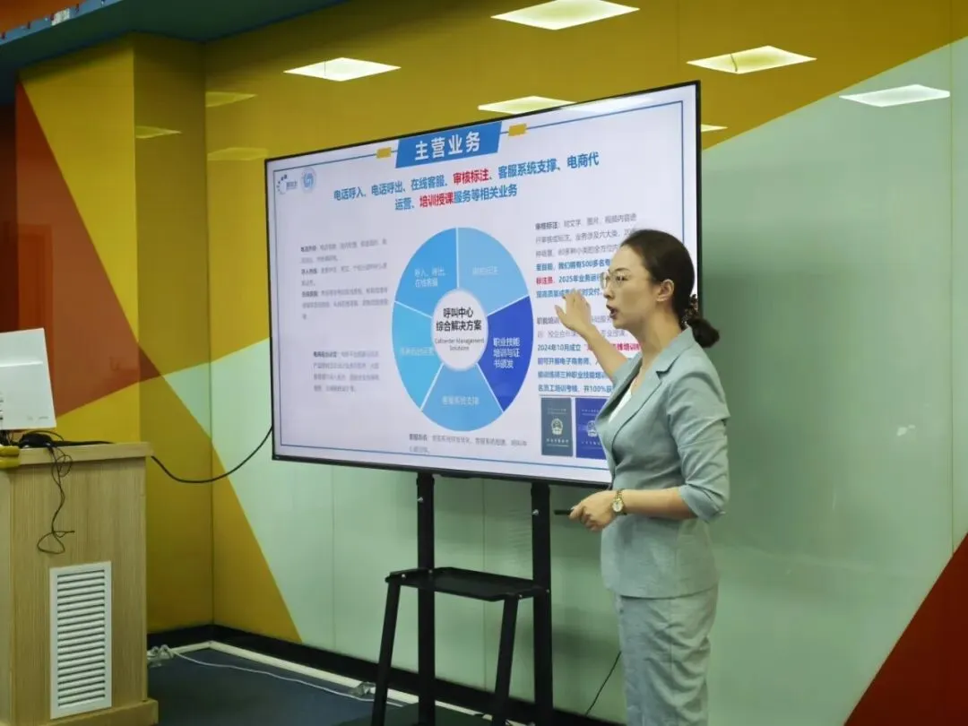 参观结束后,双方移步至我司3楼开展座谈交流。座谈会上,我司人力资源总监陈丽对陈晖阳书记一行的到来表示热烈欢迎,并围绕企业发展概况、人才需求痛点、校企合作初步设想,以及在产教融合方面的实践经验进行了详细介绍。