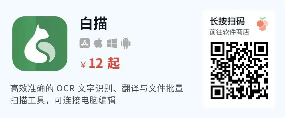 白描是一款 OCR 图片转文字扫描识别工具,具备高准确度文字识别提取、表格识别转 Excel、批量识别、识别后翻译、文件扫描等功能,多平台可用,获 App Store、华为应用市场及众多用户推荐。