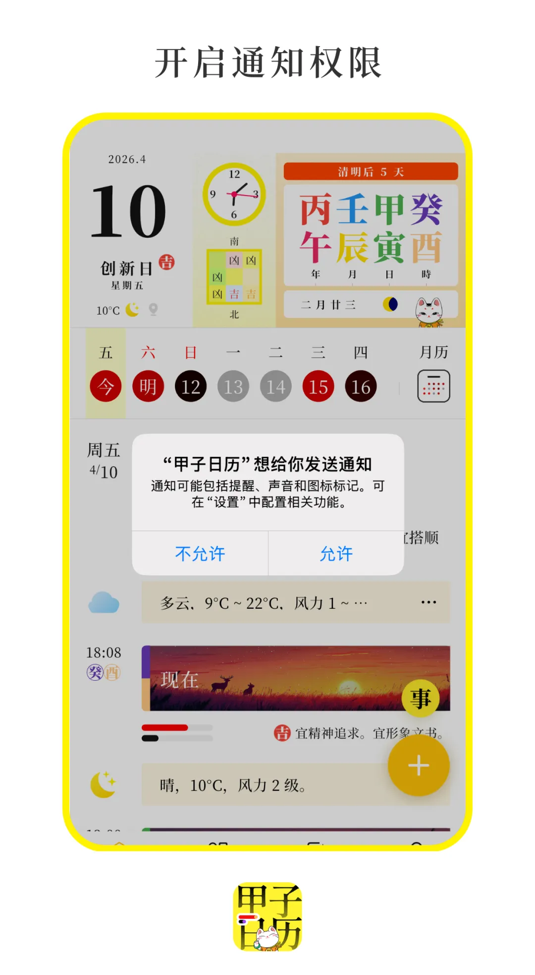 首次打开更新后的 APP,将弹出通知权限申请弹窗,点击「允许」,即可开启全部通知功能,包括运势播报与日程提醒。