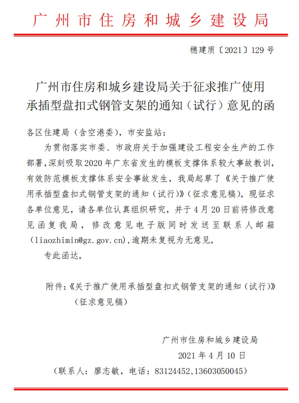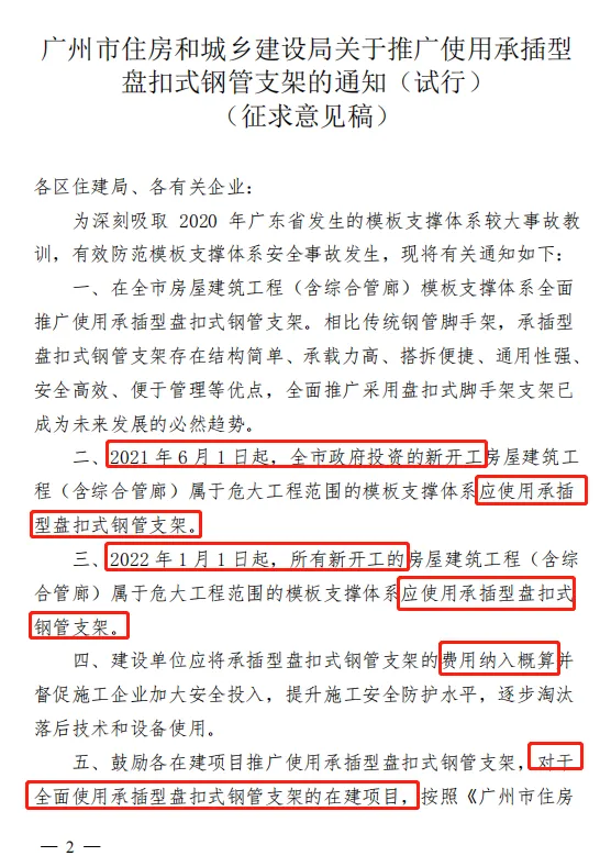 近日,广州市住建局《关于征求推广使用承插型盘扣式钢管支架的通知(试行)意见的函 》(穗建质〔2021〕129号)提出: