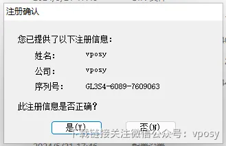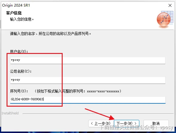 7.填写安装信息:①输入用户名和公司名称【Vposy】②输入序列号【GL3S4-6089-7609063】③点击【下一步】。