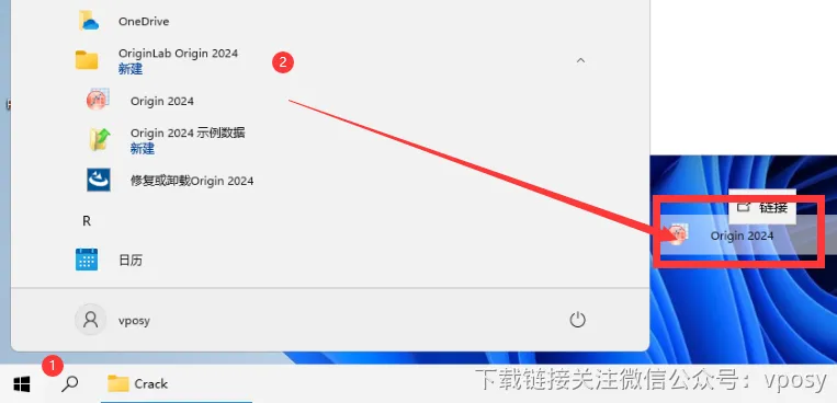 19.创建桌面快捷方式:①点击桌面任务栏中的【开始图标】>点击【所有应用】>双击展开【OriginLab Origin2024】文件夹②将【Origin2024】图标拖到电脑桌面。