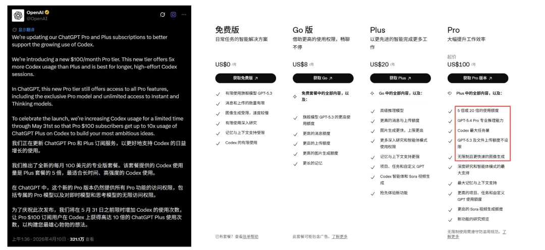 OpenAI 在现有 Go、Plus 和 200 美元 Pro 套餐之间新增 Pro 100 美元订阅,面向高强度工作者,提供更大的使用额度和高级模型访问。