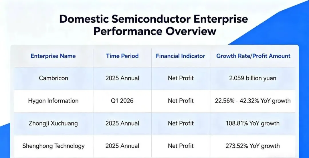 从国产芯片到存储部件,从光模块到PCB厂商,相关企业的业绩迎来爆发式增长。寒武纪在2025年首次实现年度盈利,净利润达20.59亿元,标志着国产算力芯片替代进入收获期;海光信息2026年一季度净利润预计同比增长22.56%至42.32%;光模块龙头中际旭创2025年净利润同比增长108.81%,PCB厂商胜宏科技同年净利润更是暴增273.52%。