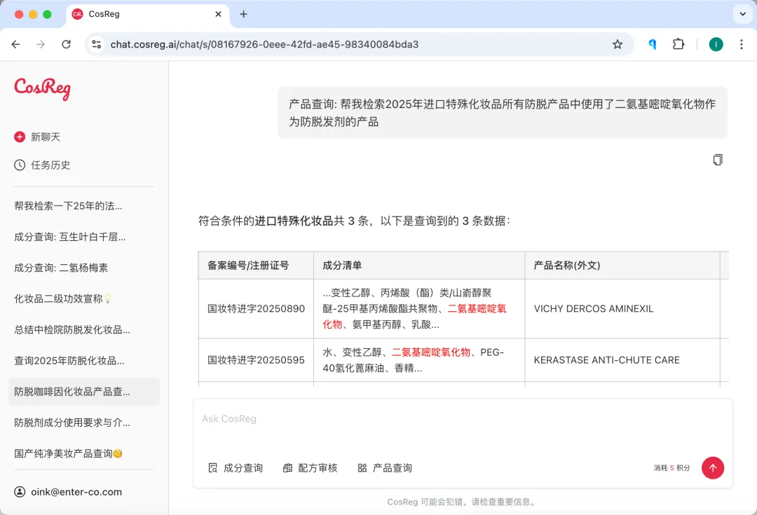通用AI可以写出一段逻辑通顺、表达漂亮的宣称,但它并不知道监管红线在哪里,也无法判断某些表达是否会在备案或审查中被直接否决,而CosReg的价值就在于:它把法规、原料数据和实际案例转化为可以被调用的判断体系,让“合规”这件事从经验问题,变成一个可以被验证的问题。
