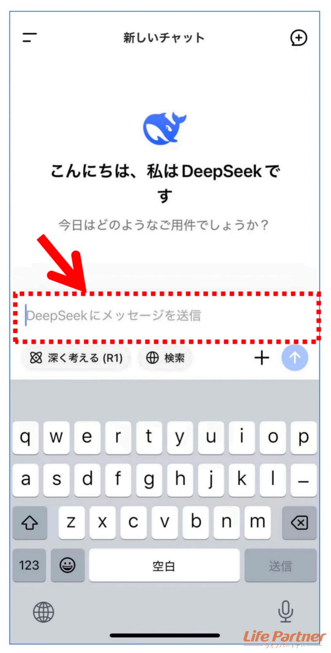 最初の画面、中段にある入力欄に質問を入力しましょう!