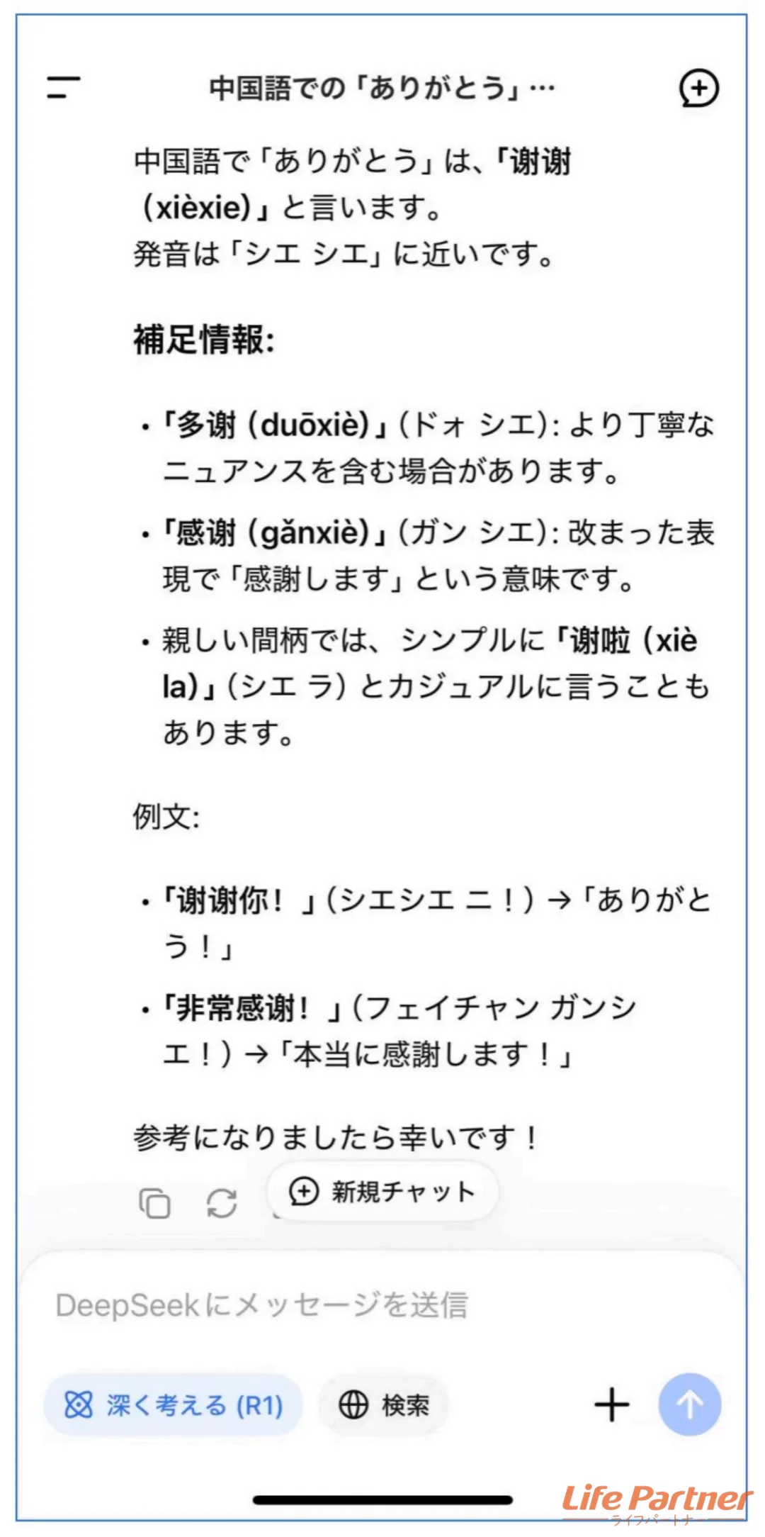 入力欄に「ありがとうの中国語は?」と入力して送信