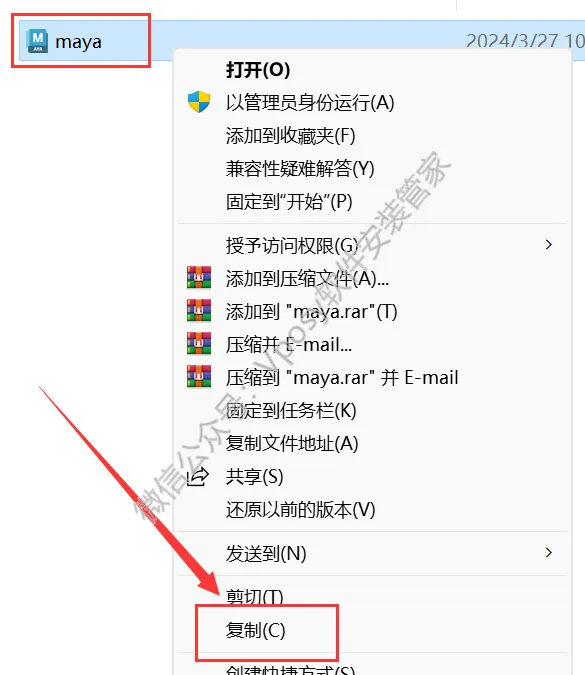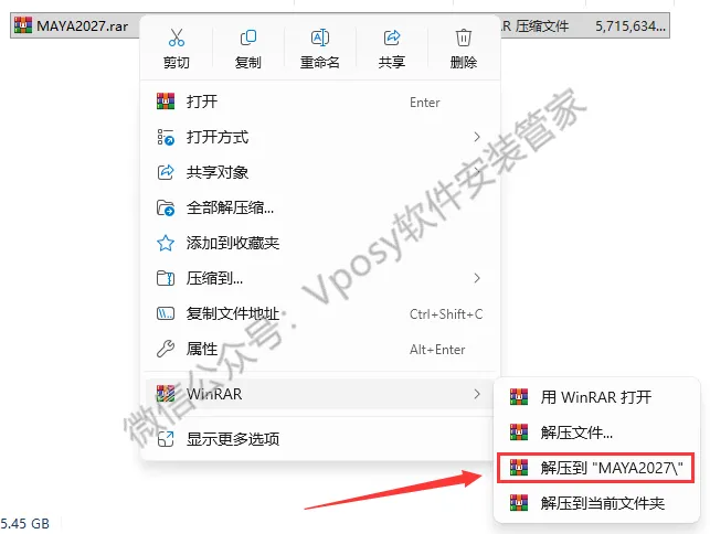 1.解压安装包:①鼠标右击【Maya2027】压缩包②选择电脑上安装的解压软件(如:WinRAR)③点击【解压到2025】。