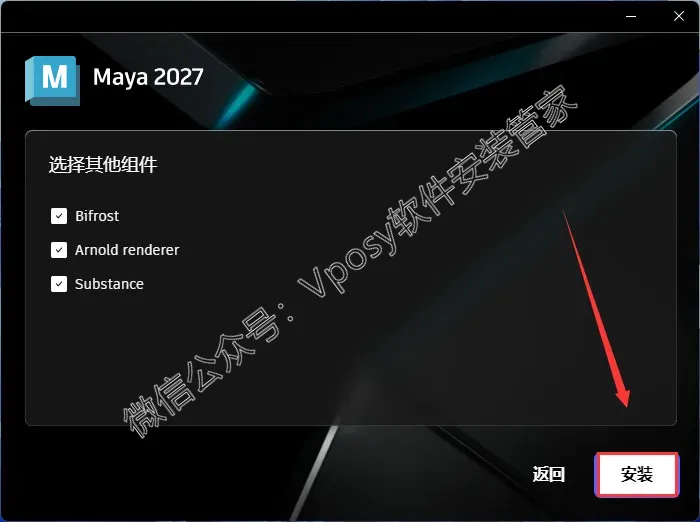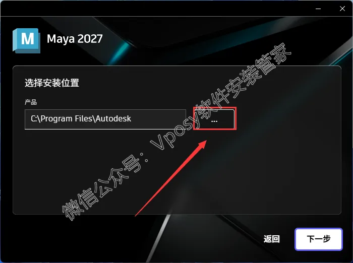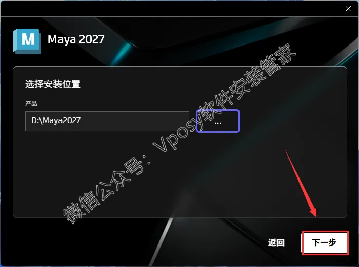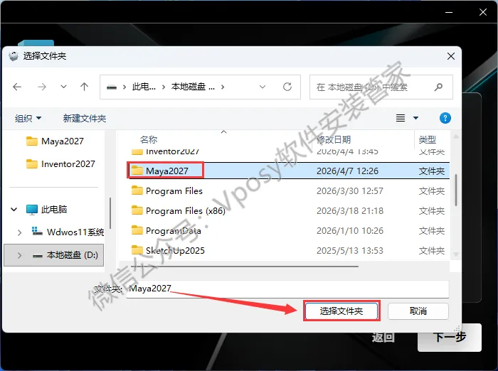 6.选择需要将软件安装的磁盘(如:D盘),新建一个【Maya2027】并选中,点击【选择文件夹】。