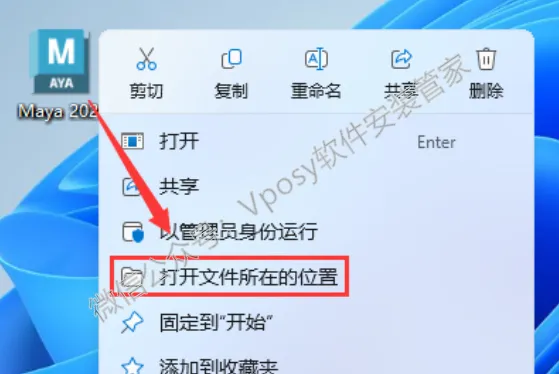 14.鼠标右击桌面【Maya2027】图标选择【打开文件所在的位置】。